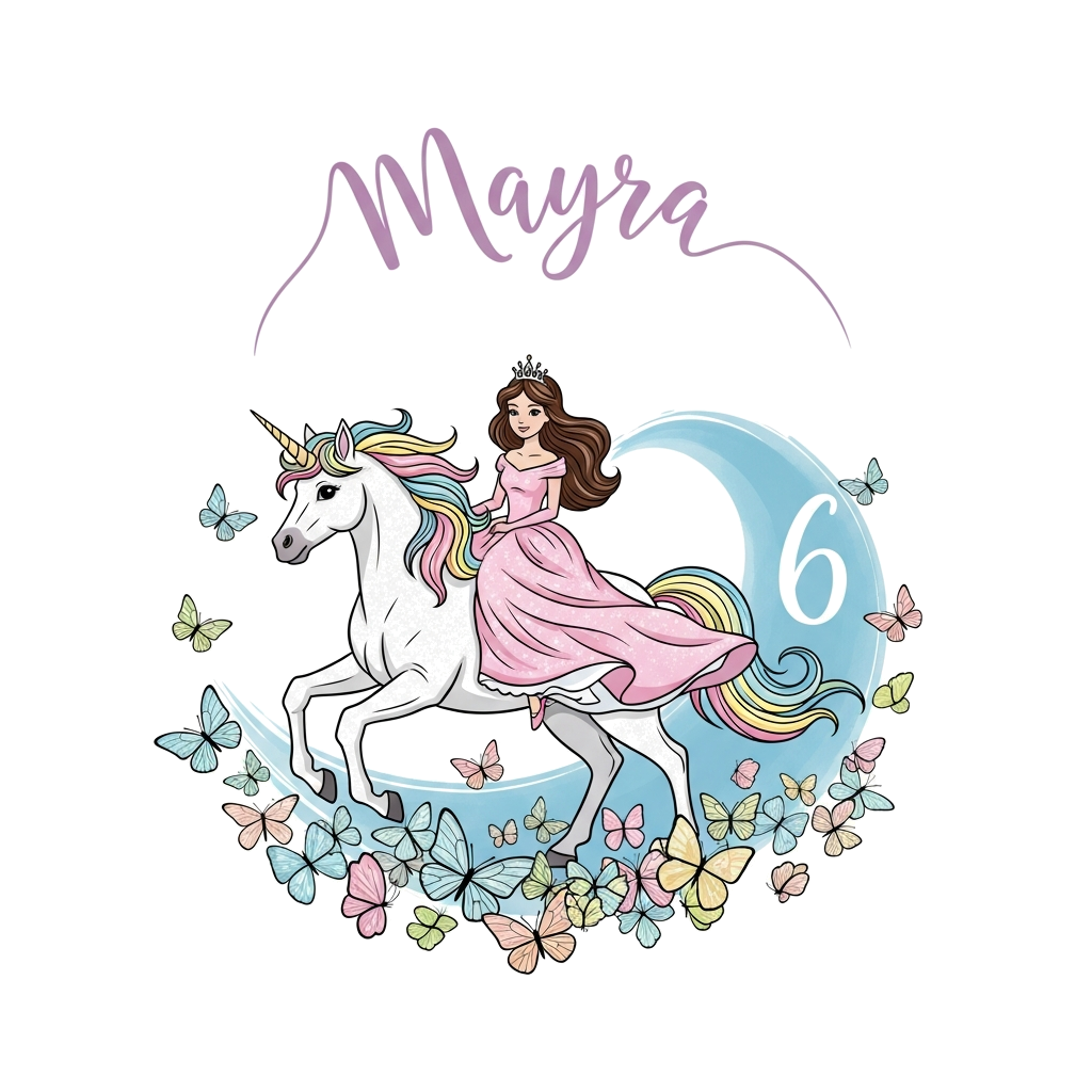 "A whimsical illustration of a graceful princess riding a sparkling unicorn through a field of colorful butterflies, with the name 'Mayra' elegantly incorporated into the scene, number 6 subtly integrated into the background, in a soft pastel watercolor style."