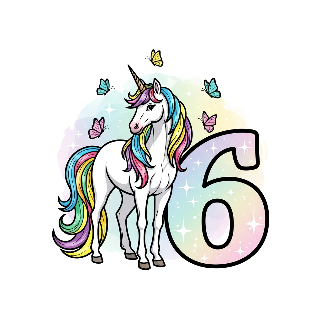"A majestic unicorn with a flowing rainbow mane, adorned with delicate butterflies, standing gracefully beside a magical number '6', set against a soft, dreamy pastel background with sparkling stars. Elegant watercolor style."