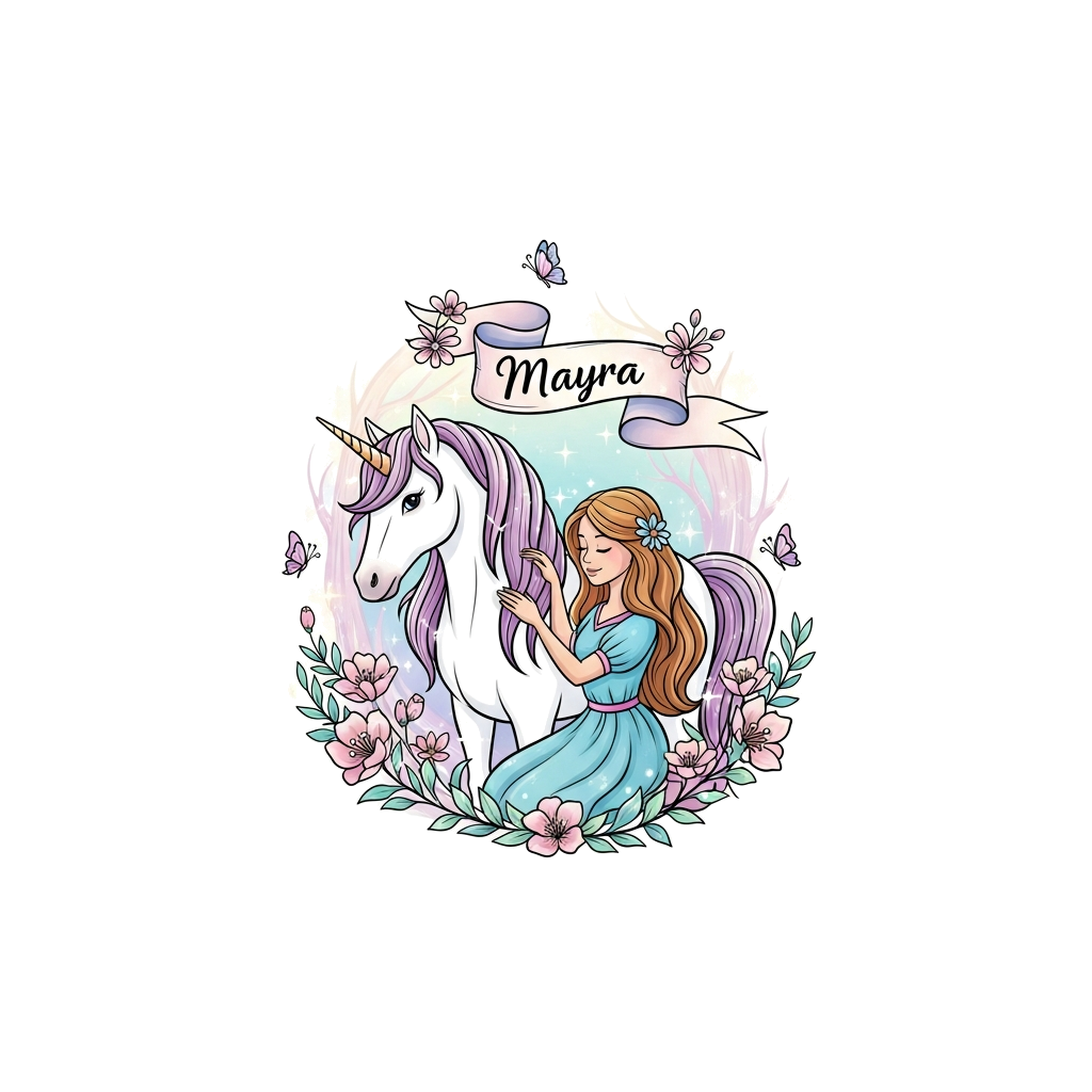 "An elegant, whimsical illustration of a beautiful princess with flowing hair, gently petting a majestic unicorn in an enchanted forest. Delicate, glowing flowers and butterflies surround them. The name 'Mayra' is subtly integrated into a floating, ethereal banner. Soft, pastel watercolor style."