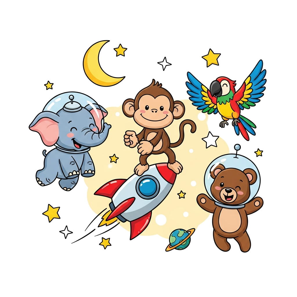 "A vibrant illustration of a diverse group of cute, friendly cartoon animals (e.g., a baby elephant, a playful monkey, a little bear, a cheerful parrot) flying in space smiling, surrounded by starry night in a warm, inviting style."