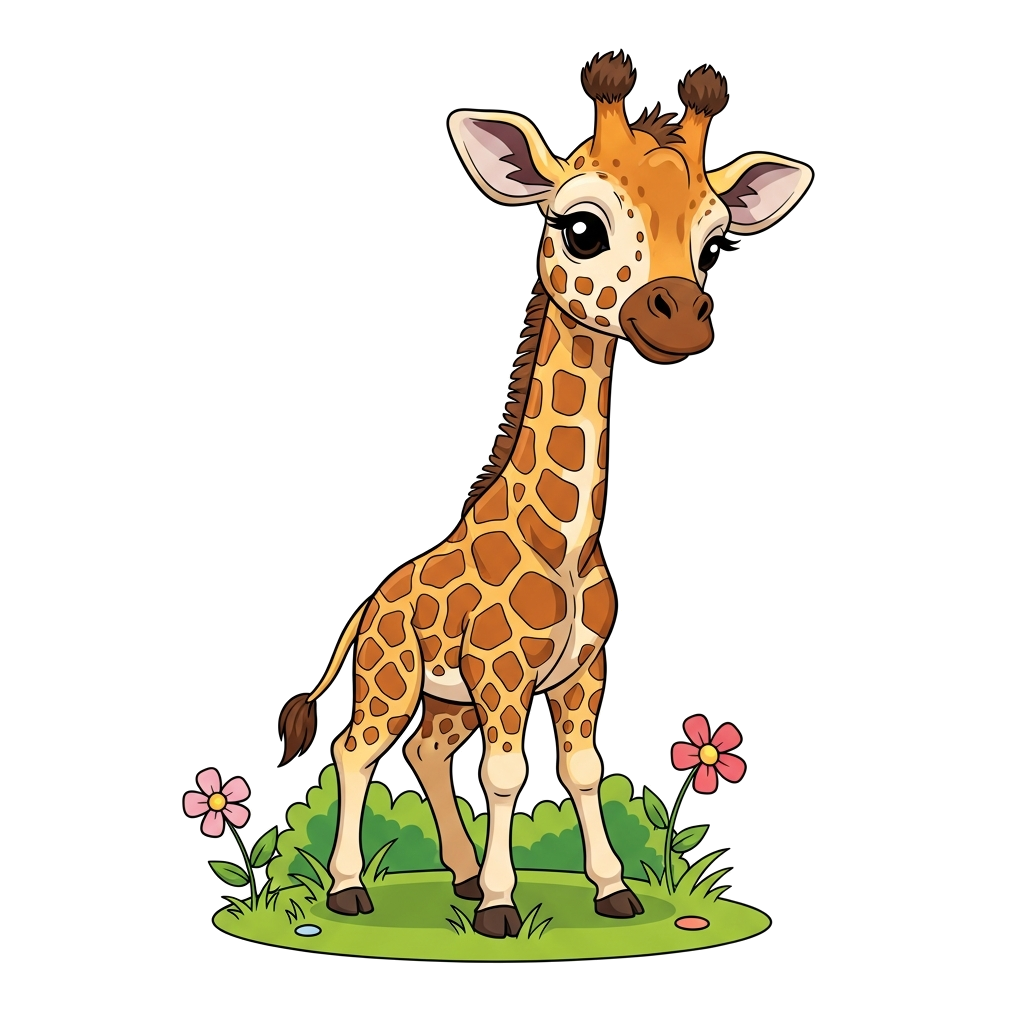 "A gentle, realistic baby giraffe with soft, friendly eyes, standing in a lush green field with a few whimsical flowers, in a warm, inviting art style."
