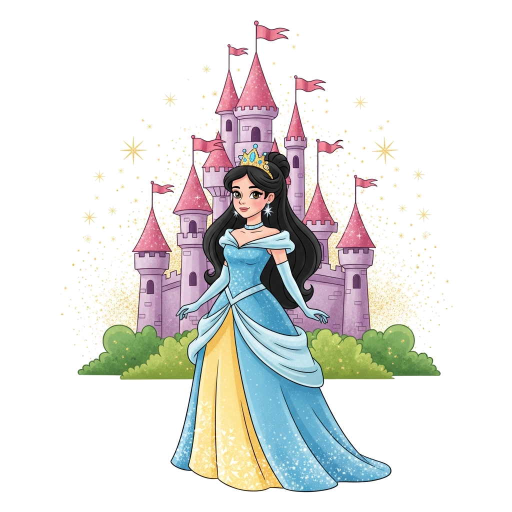 "An elegant cartoon princess with a sparkling crown and a flowing gown, standing gracefully in front of a magical castle with whimsical turrets, surrounded by glitter and stars, in a vibrant, storybook illustration style."