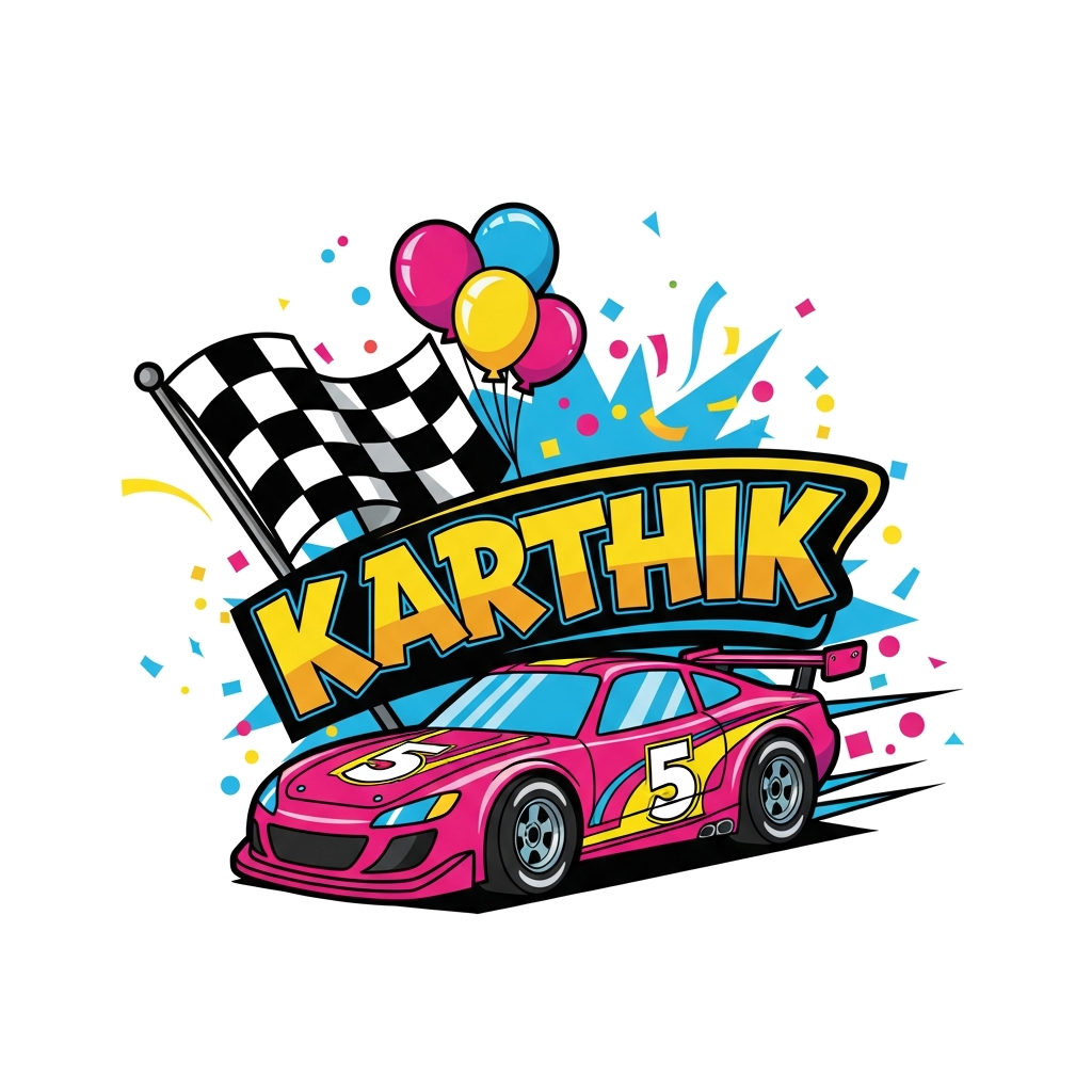 "A vibrant and funky cartoon race car, number 5 on its side, speeding past a checkered flag. 'Karthik' is playfully integrated into the track or banner, with confetti and balloons in the background, bold and dynamic."