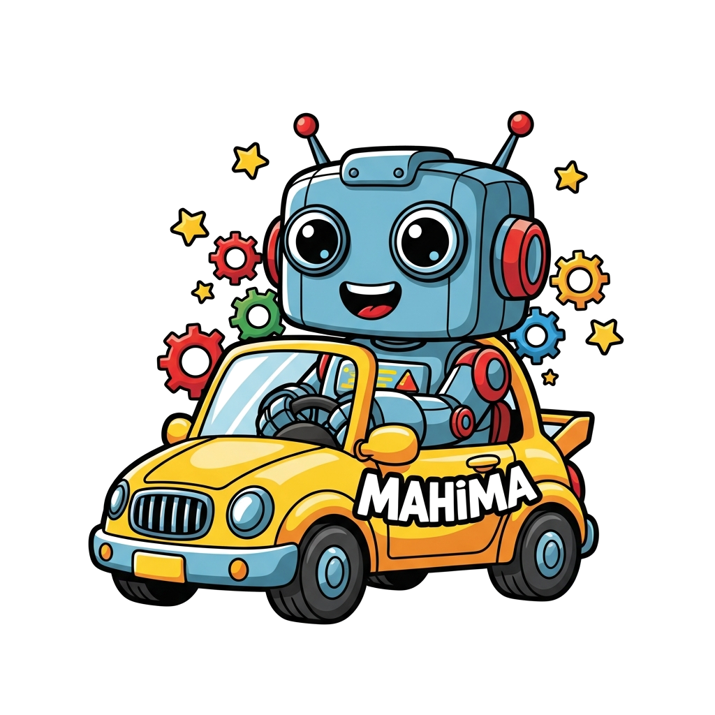 "A cheerful, chunky robot with big friendly eyes driving a bright yellow cartoon car, surrounded by colorful gears and stars. The name 'Mahima' is playfully integrated into the car's design. Vibrant and dynamic illustration style."