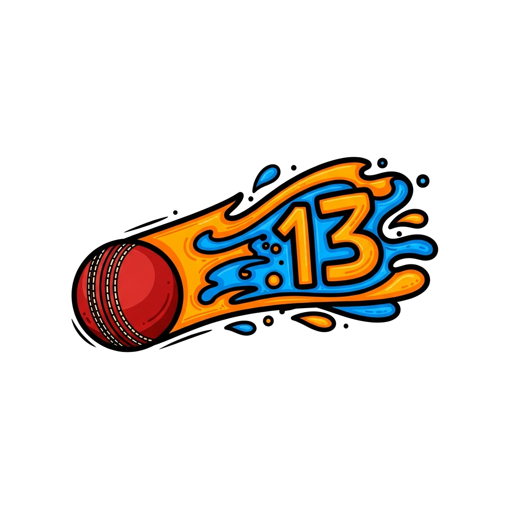 "A dynamic, modern graphic illustration of a cricket ball mid-air, leaving a trail of abstract lines and shapes in vibrant blues and oranges, with the number 13 subtly integrated into the design."