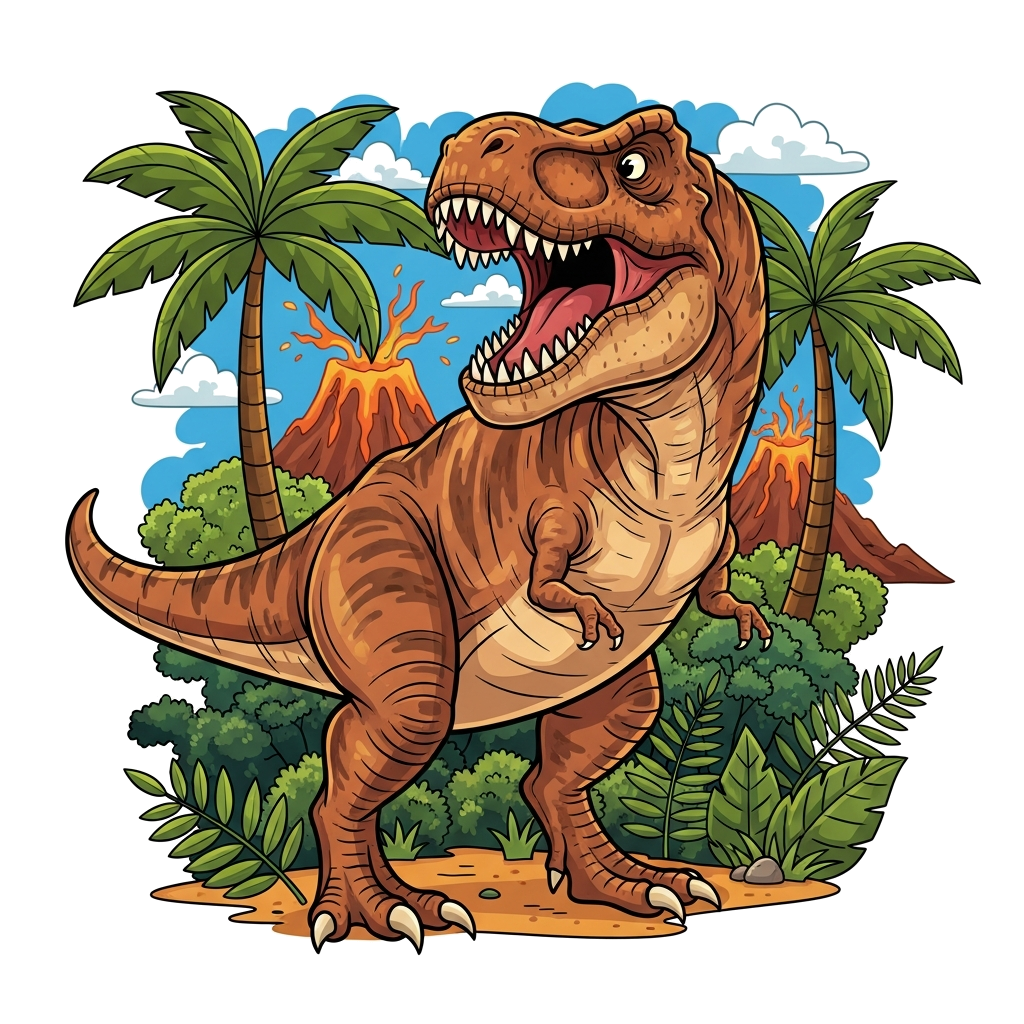 "A majestic Tyrannosaurus Rex in a detailed, realistic style, roaring amidst a prehistoric jungle, with dramatic lighting and earthy tones."