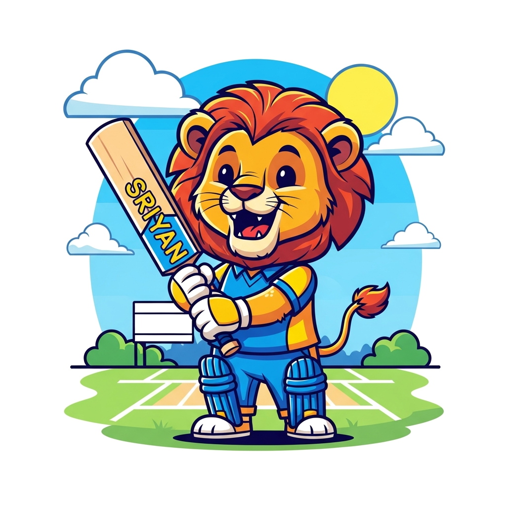 "A cheerful cartoon lion cub in a cricket uniform, holding a bat and smiling, with the name 'Sriyan' subtly integrated into the design. The background is a simplified cricket pitch with a sunny sky, vibrant and playful art style."