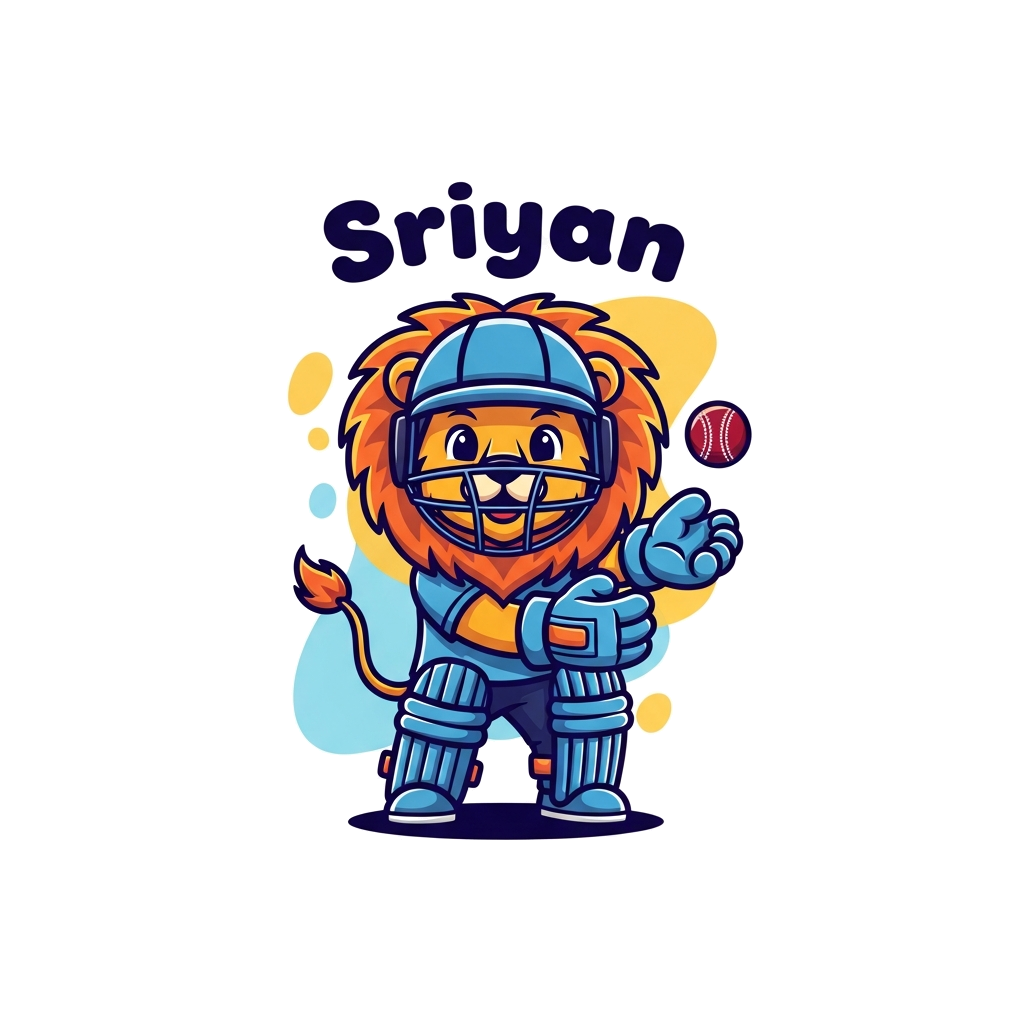 "A cheerful cartoon lion cub in a cricket uniform, holding a bat and smiling, with the name 'Sriyan' subtly integrated into the design. The background is a simplified cricket pitch with a sunny sky, vibrant and playful art style."