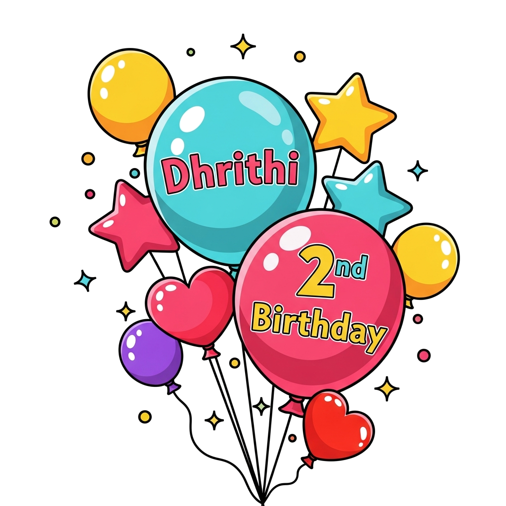 "A vibrant cartoon illustration of a cheerful collection of balloons in various shapes and sizes (round, star, heart), with 'Dhrithi' written playfully on one large balloon and '2nd Birthday' on another, surrounded by tiny sparkling confetti, in a cute, colorful, and joyful style."