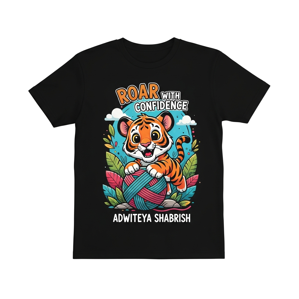 "A super cute and playful cartoon Bengal tiger cub, with big friendly eyes and bright orange stripes, pouncing happily on a giant, colorful yarn ball in a whimsical jungle setting. The scene is bursting with vibrant colors and joyful energy. Add name at back of T-shirt Adwiteya Shabrish in front Roar with confidence on above tiger picture add Name Adwiteya below image"