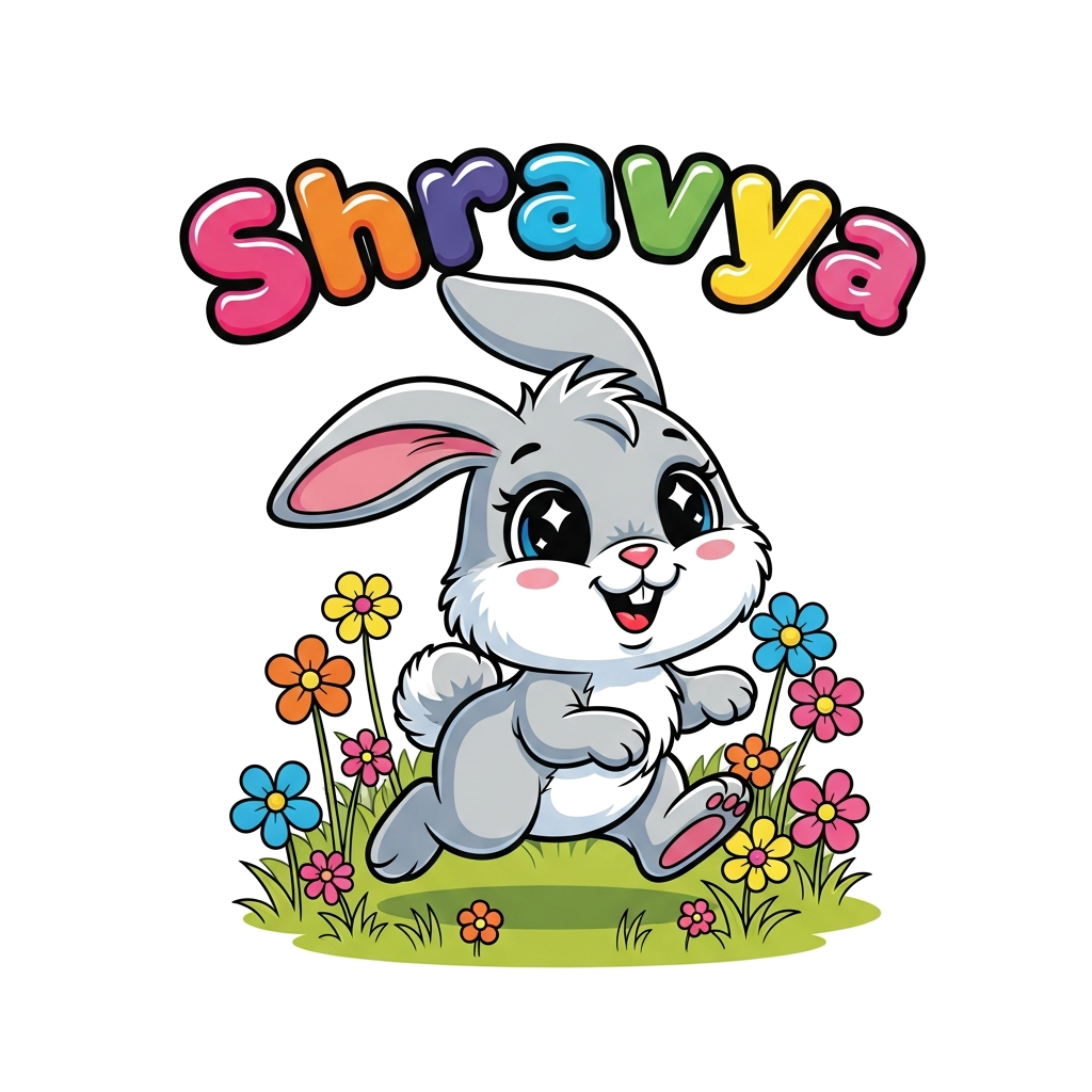 "A super cute, fluffy cartoon rabbit with big, sparkling eyes, happily hopping through a field of colorful, whimsical flowers. The name 'Shravya' is playfully written in bubbly, rainbow letters above the rabbit."