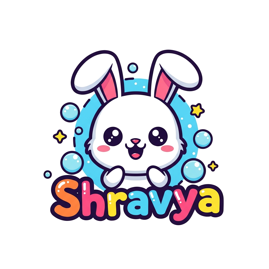 "A super cute, happy cartoon rabbit character, with big friendly eyes, surrounded by floating bubbles and tiny stars, with the name 'Shravya' playfully integrated into the design, bright and cheerful colors, kawaii style illustration."
