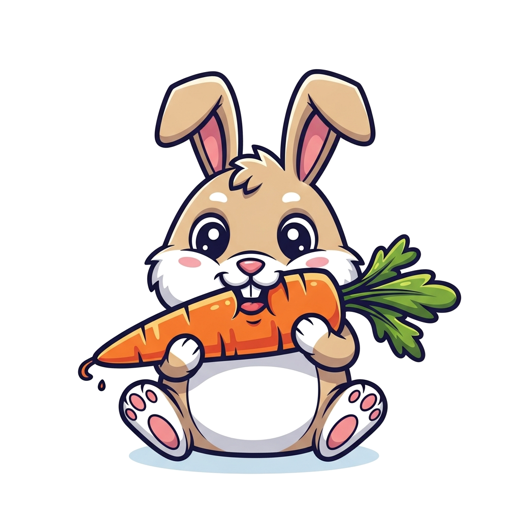"A super cute, chubby cartoon rabbit happily munching on a giant carrot, with big round eyes and a joyful expression, in a vibrant and playful kawaii style illustration."