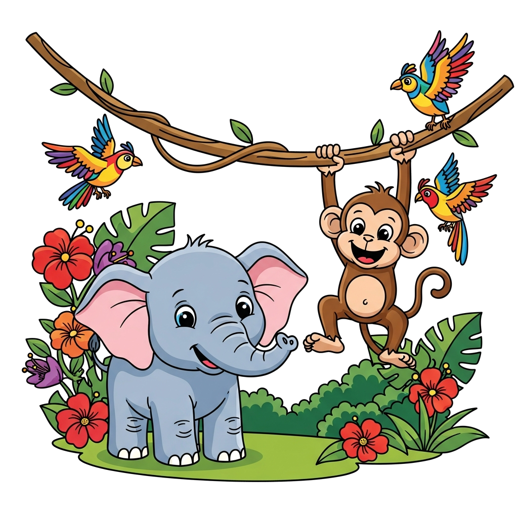 "A cheerful baby elephant and a playful monkey swinging from a vine in a lush, vibrant jungle, surrounded by bright flowers and exotic birds, in a colorful cartoon style."