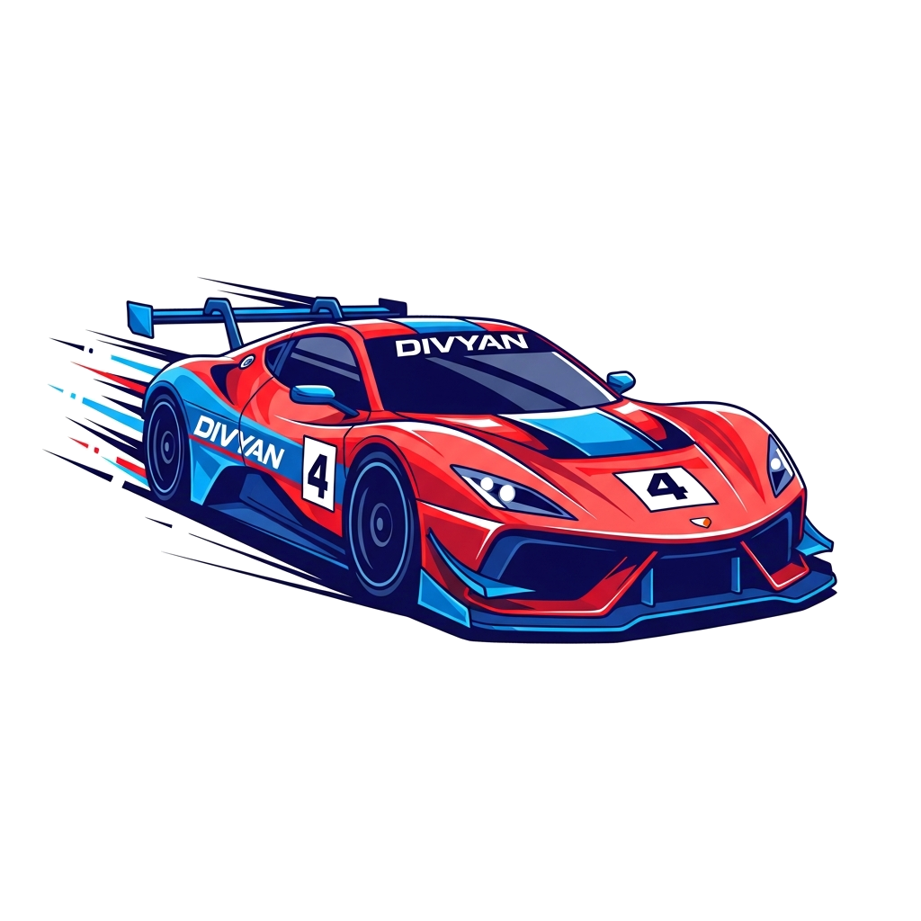 "A dynamic, bold illustration of a sleek, futuristic race car in vibrant red and blue, speeding forward with motion blur. The number '4' is integrated into the design, perhaps on the side or hood, with 'Divyan' subtly incorporated in a cool, stylized font. Energetic lines and a sense of motion, vector art style."
