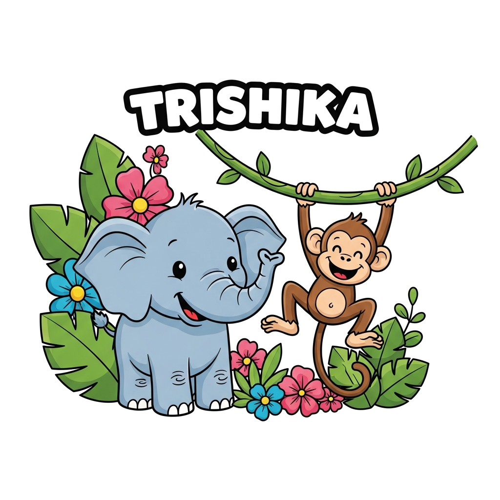 "A cheerful cartoon baby elephant and a playful monkey swinging from a vine, surrounded by lush green leaves and colorful flowers, in a vibrant, cute, and cartoonish style. Text: Trishika."
