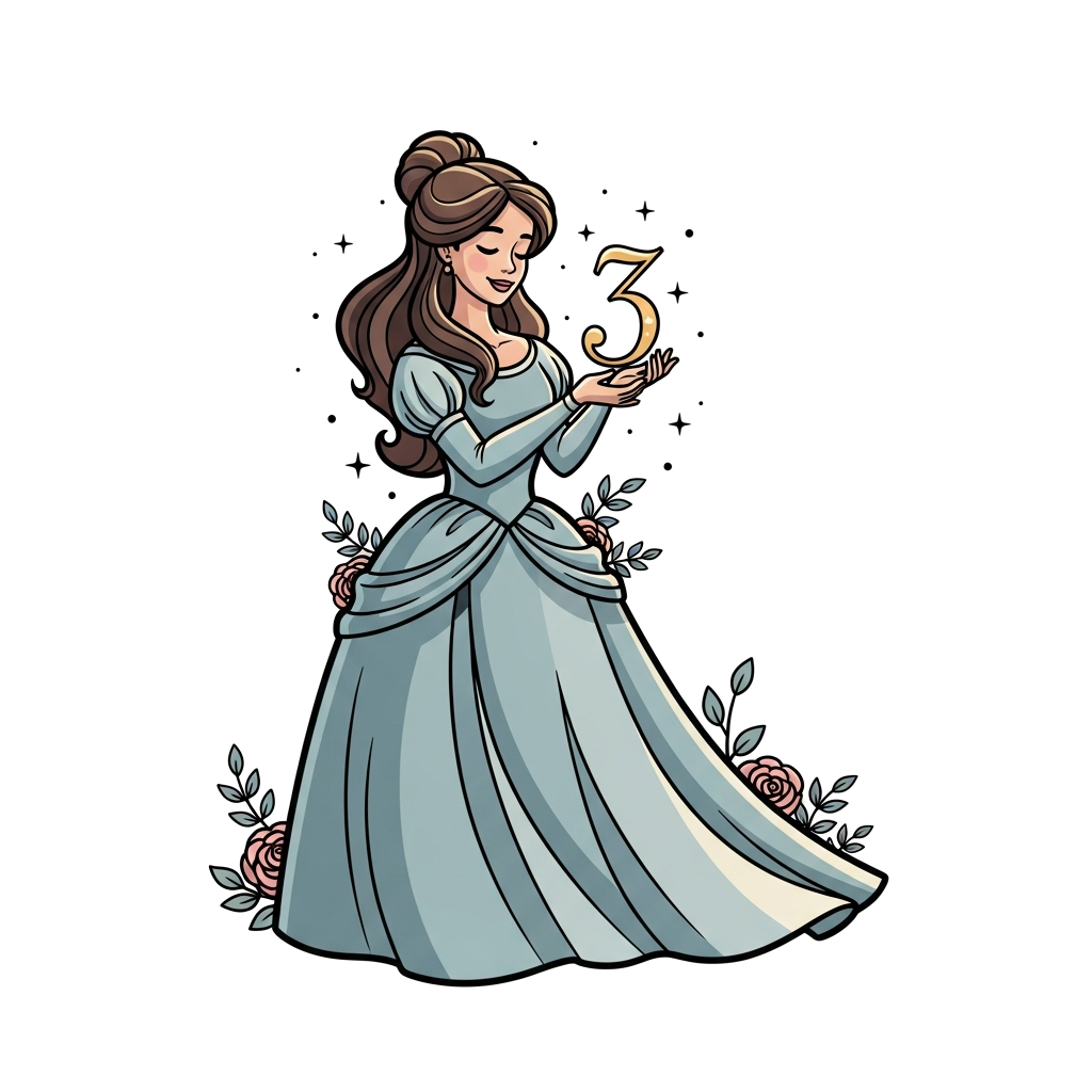 "An elegant fairytale princess with a flowing gown and a gentle smile, holding a delicate golden number '3', surrounded by subtle sparkles and soft floral accents, in a classic storybook illustration style with muted pastel colors."