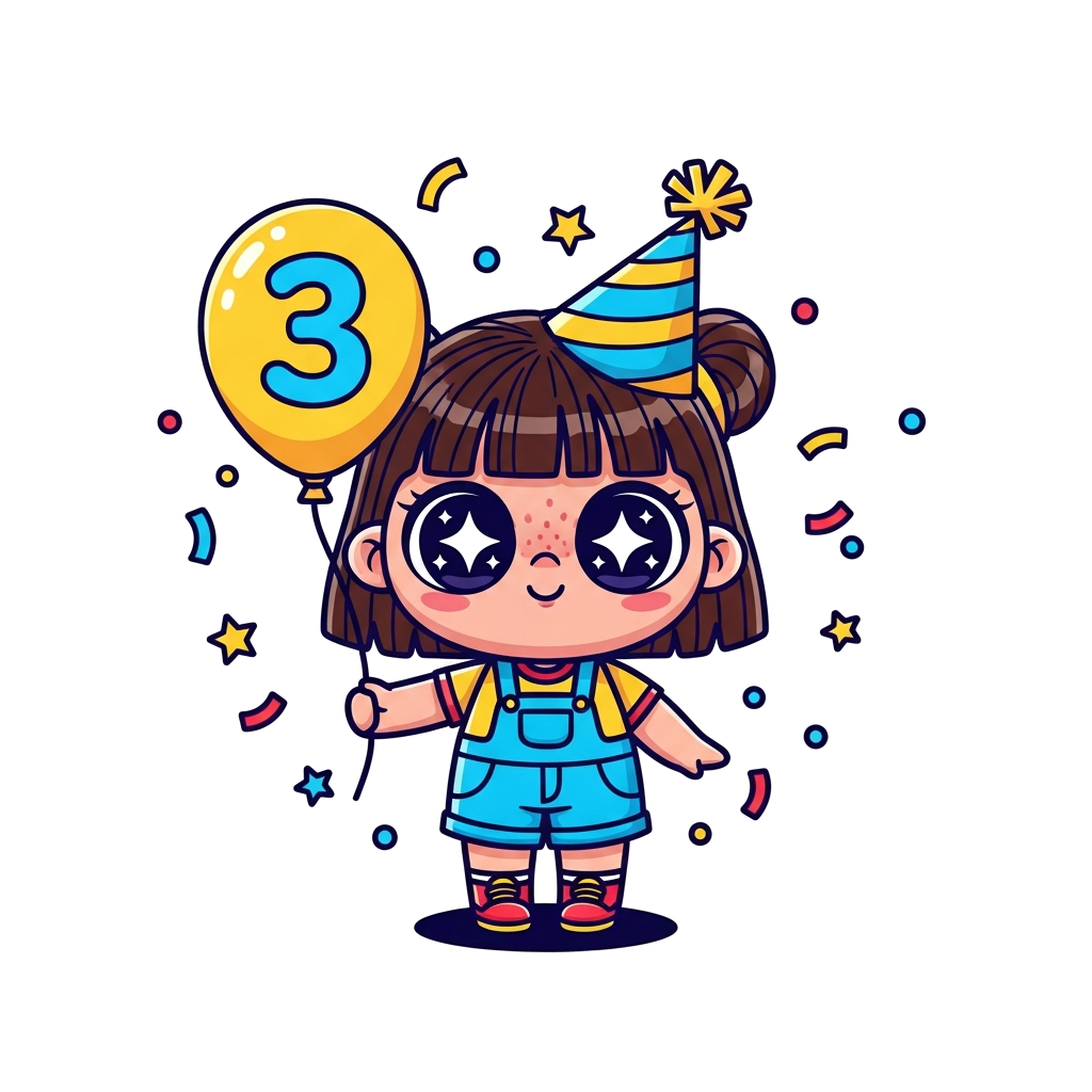 "A cute cartoon doll with big, sparkling eyes, wearing a party hat and holding a balloon with the number '3', surrounded by confetti and tiny stars, in a vibrant, playful style."