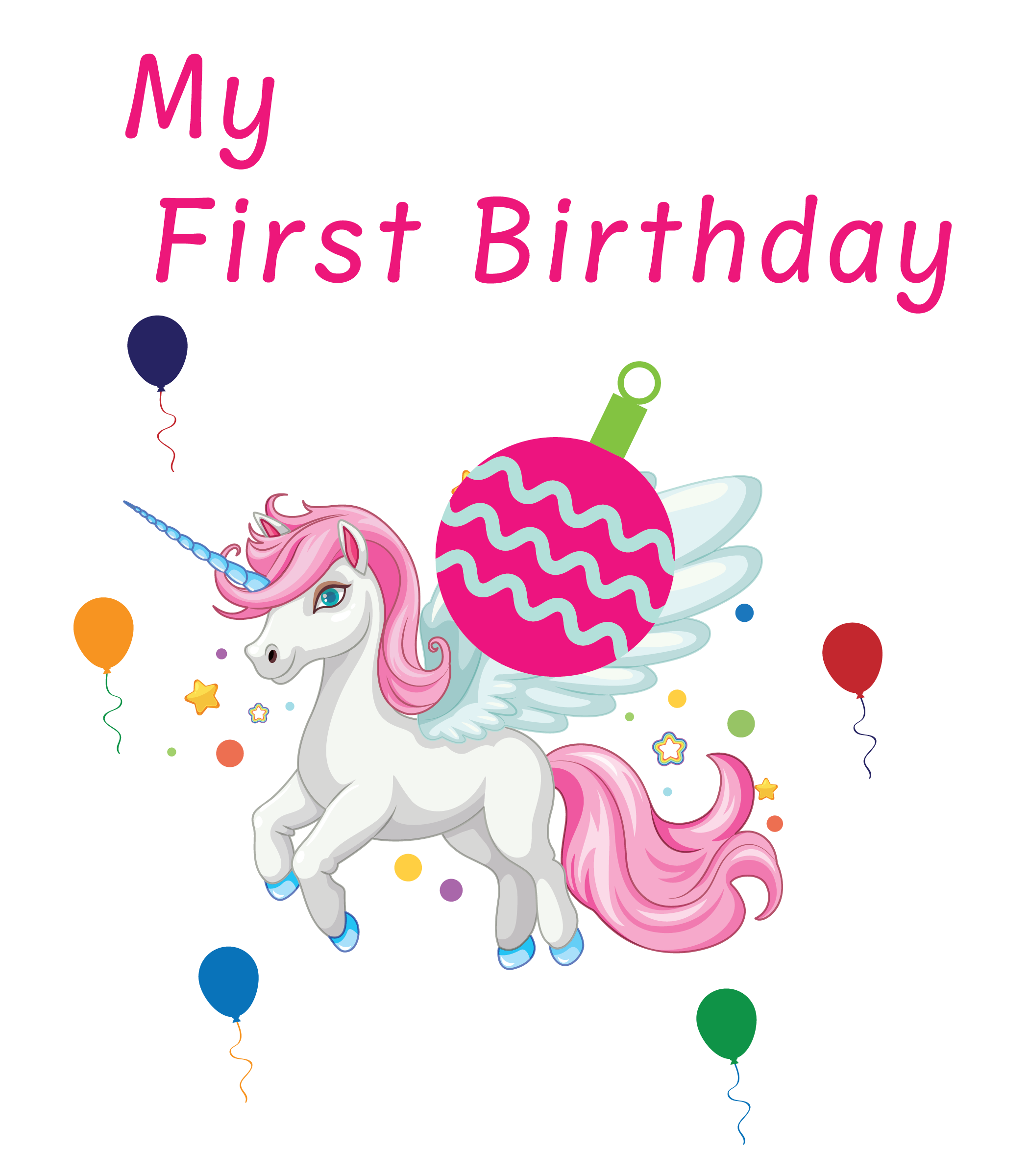 "Adorable unicorn “My First Birthday” printed t-shirt with colorful balloons—perfect for baby’s first birthday celebration. 👶🎂"