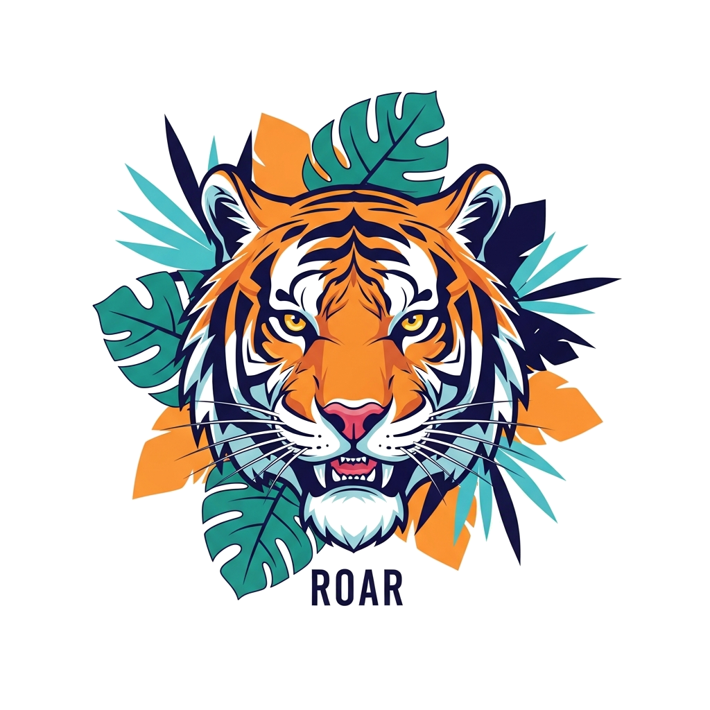 "A majestic, stylized tiger head in a bold and cool art style, with sharp but friendly lines, surrounded by abstract jungle leaves, text 'Roar' integrated subtly below, vibrant colors."