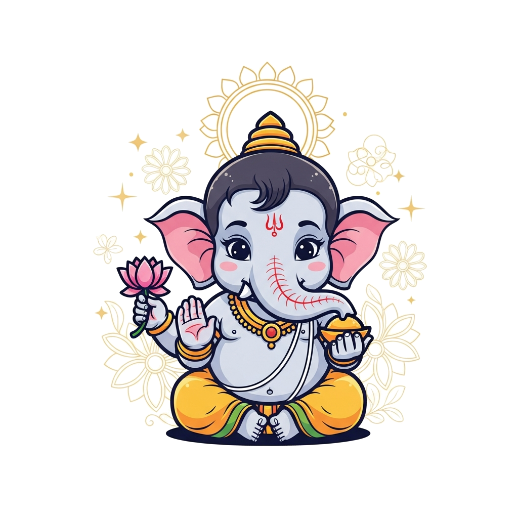 "A super cute, chubby baby Ganesha illustration, with big eyes and a gentle smile, holding a tiny lotus flower, surrounded by delicate traditional Indian floral patterns and a soft, auspicious glow. Cartoon style, pastel colors with gold accents."