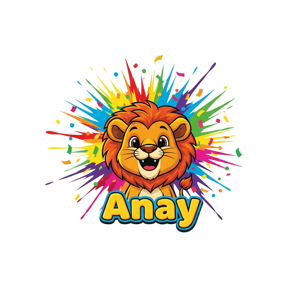 "A charming cartoon lion cub with an infectious smile, peeking out from behind a cloud of dazzling rainbow confetti and swirling paint splatters. The name 'Anay' is prominently displayed in a bold, cheerful font, integrated into the festive, high-energy illustration."