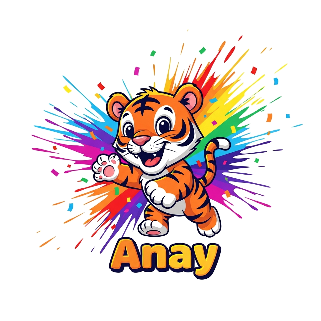 "A super cute and energetic cartoon baby tiger, mid-leap with a friendly roar and a wide smile, enveloped by a vibrant explosion of rainbow paint splatters and a cascade of confetti. The name 'Anay' is boldly written in a cheerful, bubbly font below the tiger, in a high-energy, dynamic illustration."