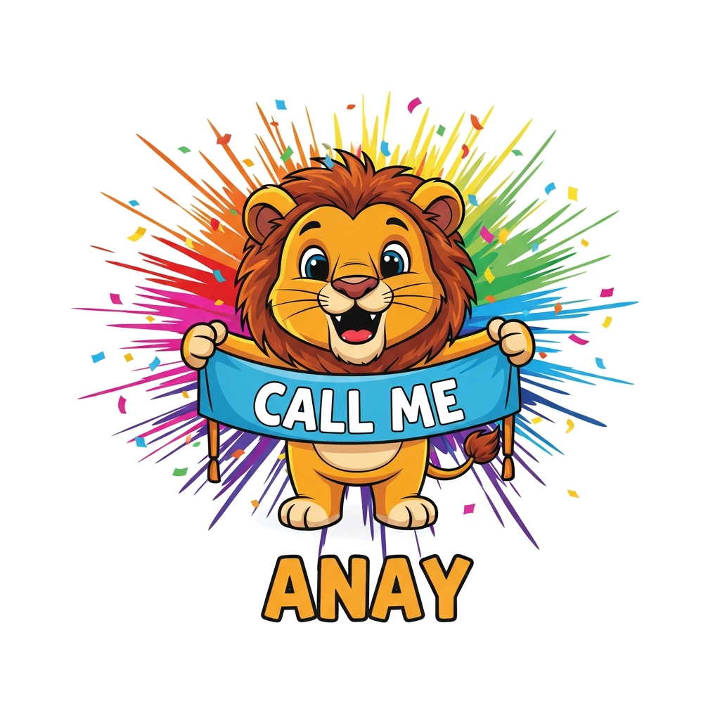 "A super cute and playful cartoon lion cub with a big friendly smile, playfully holding a vibrant banner that reads 'Call me Anay' in a cheerful, bubbly font. The lion is surrounded by a dynamic burst of vibrant rainbow paint splatters and colorful confetti, with the name 'Anay' also prominently featured below, all in a high-energy illustration style."