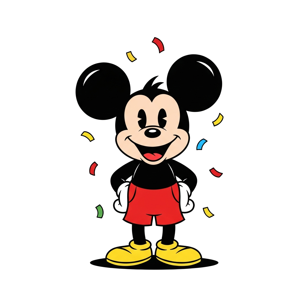 "Cute cartoon mouse character inspired by classic vintage cartoon style, big round ears, happy smiling face, wearing red shorts and yellow shoes, colorful confetti around, kids birthday theme, flat vector illustration, bold outlines, bright colors, centered design, white background, perfect for baby t-shirt print"