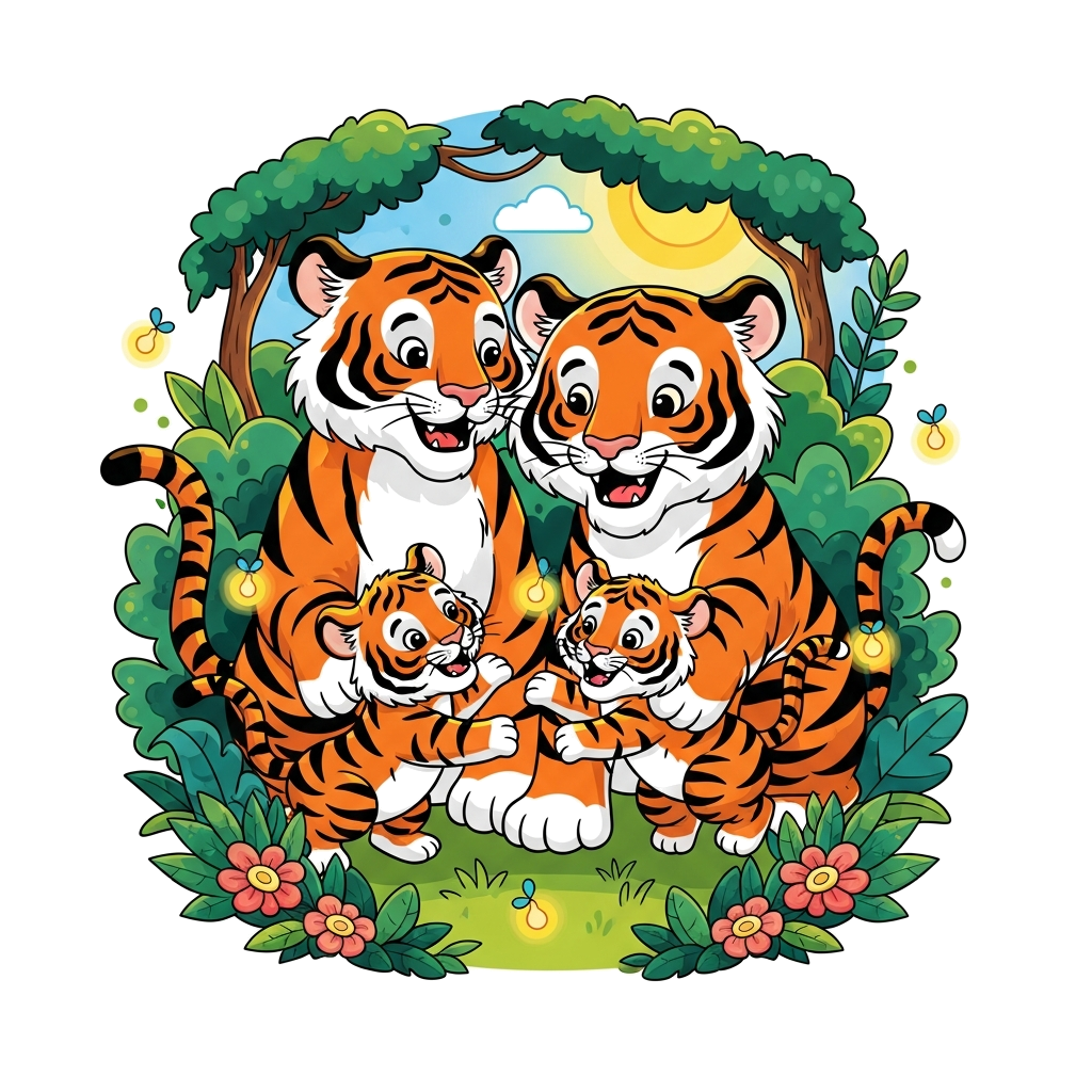 "A vibrant, child-friendly illustration of a tiger family (two adults, two cubs) joyfully playing together in a sun-drenched, lush green jungle. The cubs are playfully pouncing on each other, while the parents watch with warm, happy expressions. Bright flowers and sparkling fireflies add to the cheerful atmosphere."