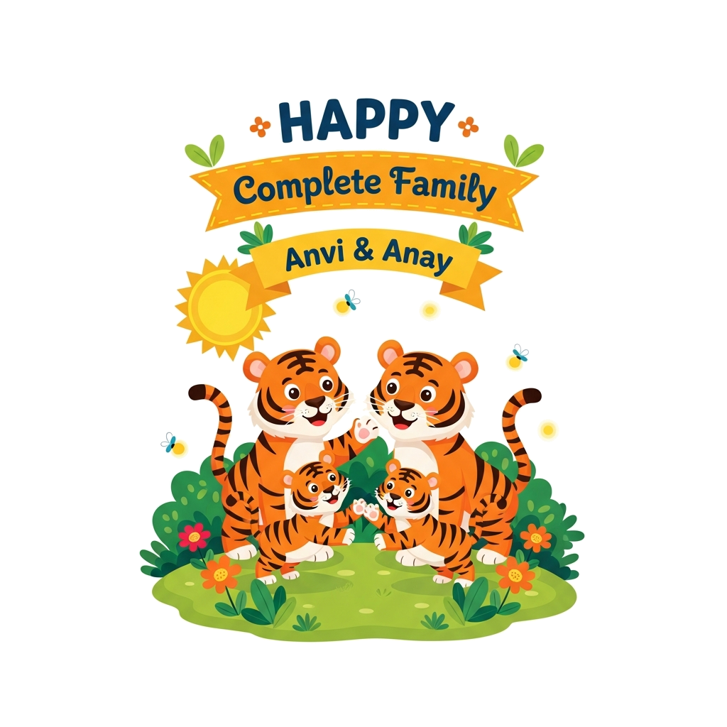 "A heartwarming illustration of a happy tiger family (two adults, two cubs) enjoying a playful moment in a lush, sun-drenched jungle, dotted with colorful flowers and glowing fireflies. The cubs are playfully interacting, and the parents have joyful expressions. Above them, a decorative banner holds the quote 'HAPPY Complete Family' in a bold, friendly font. Integrated charmingly into the scene, perhaps formed by vines or held by two friendly jungle birds, are the names 'Anvi & Anay' in a delightful, child-like script."