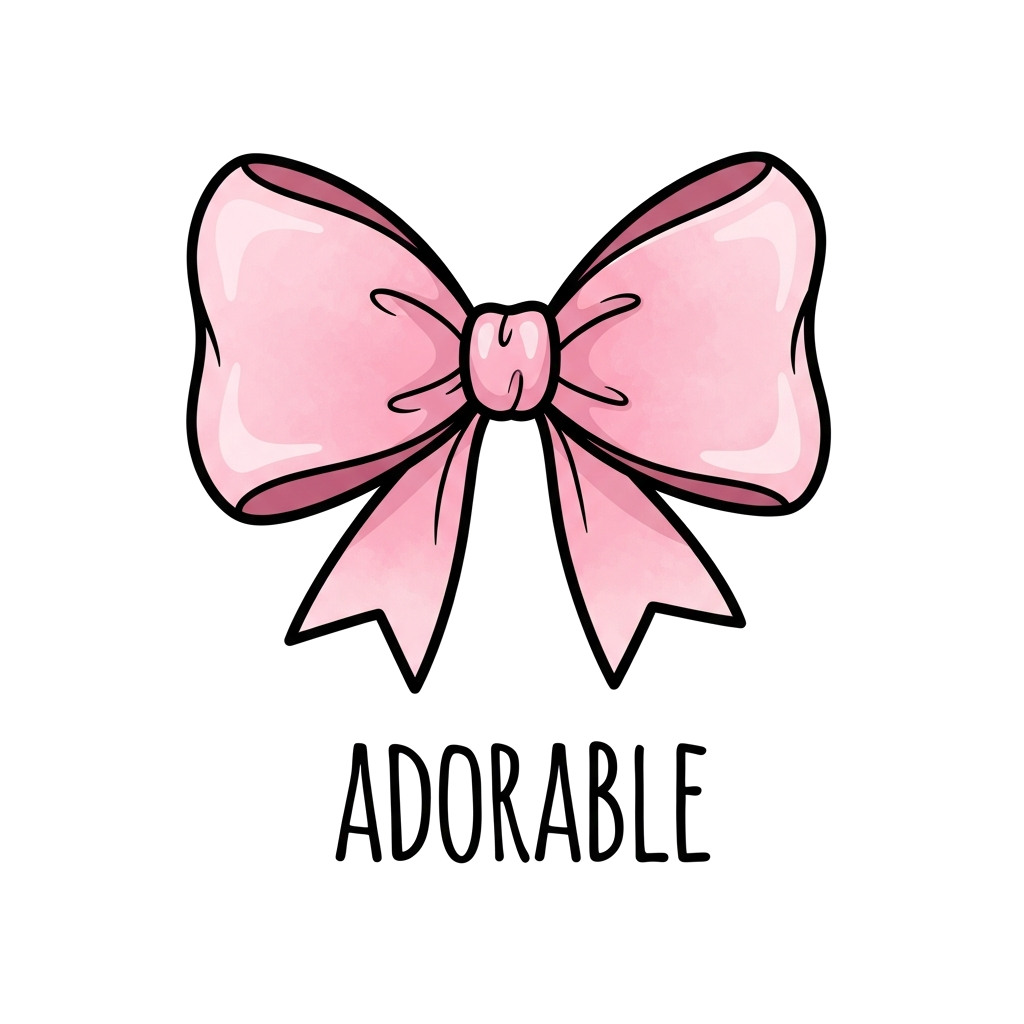 "big elegant pink bow with watercolor texture, soft pastel pink shades, cute girly baby t-shirt design, modern handwritten typography “ADORABLE”, minimal outline illustration, centered layout, clean white background, vector graphic, kids apparel print design"