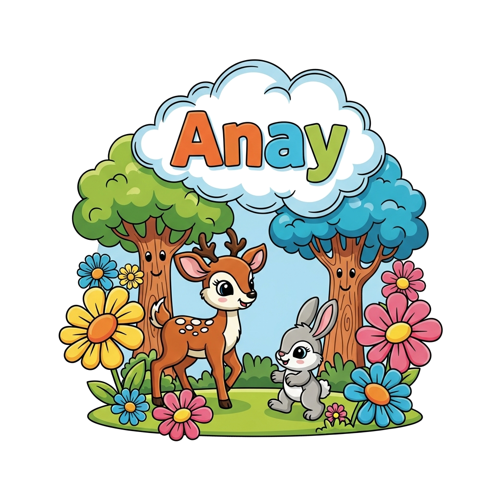 "A whimsical illustration of a baby deer and a baby bunny playing among oversized, colorful flowers and friendly trees in a vibrant forest. The name "Anay" is playfully integrated into a cloud or banner above, in a cheerful, cartoon style."