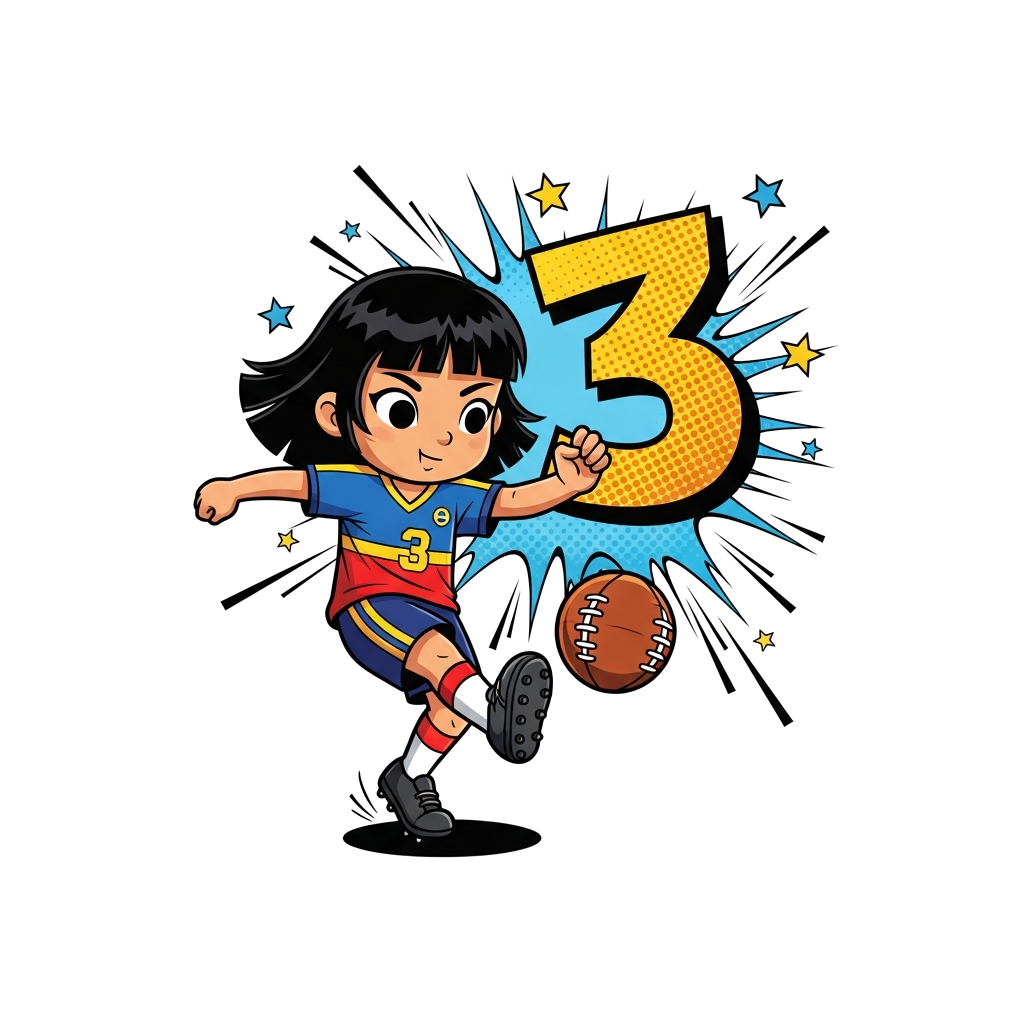 "A dynamic and cool cartoon illustration of a young girl, resembling Jhirin, in a vibrant football jersey, mid-kick with a football. The number '3' is integrated into the background with a burst of energetic lines and stars. Bold lines, bright colors, comic book style."