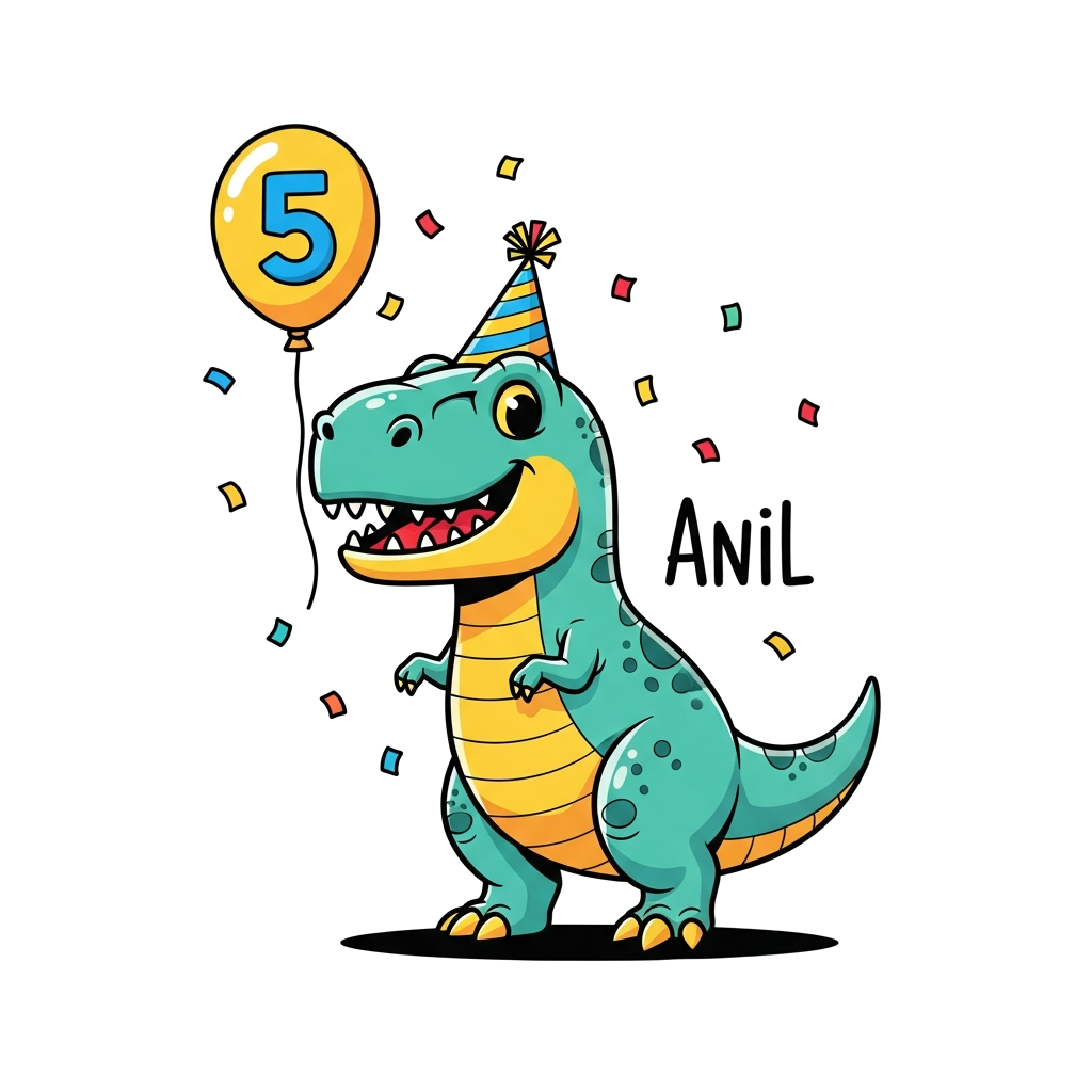 "A vibrant cartoon illustration of a friendly T-Rex wearing a party hat, holding a balloon with the number 5, with colorful confetti falling around, and the name 'Anil' subtly integrated into the scene. Playful, bright colors."