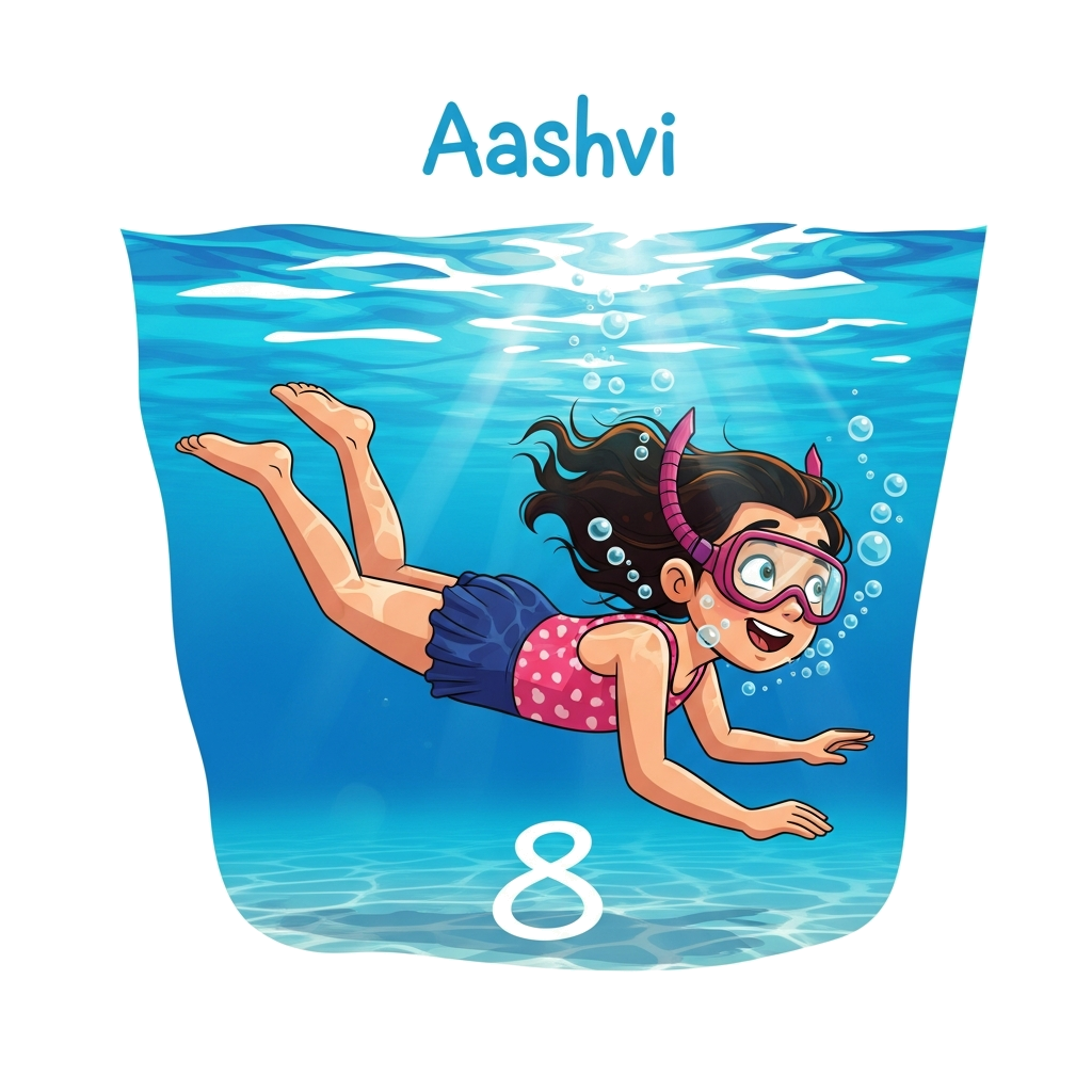 "A realistic illustration of a joyful girl named Aashvi, 8 years old, gracefully swimming underwater in a clear blue pool, surrounded by gentle bubbles and sunlit refractions, with a subtle number '8' formed by light at the bottom."