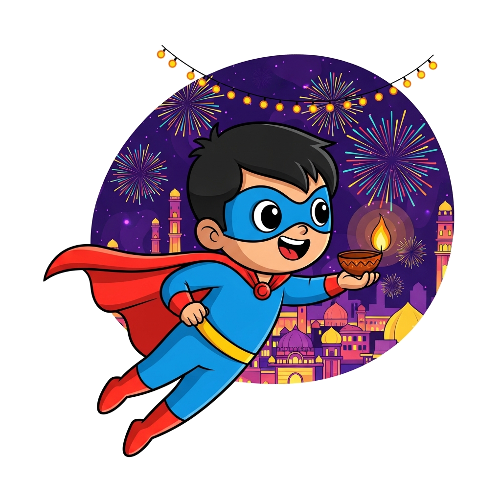 "A cute, stylized cartoon superhero child with a cape, flying gracefully over a brightly lit Indian city during Diwali night, holding a glowing diya. The background features colorful fireworks and festive lights, in a vibrant, modern playful art style."