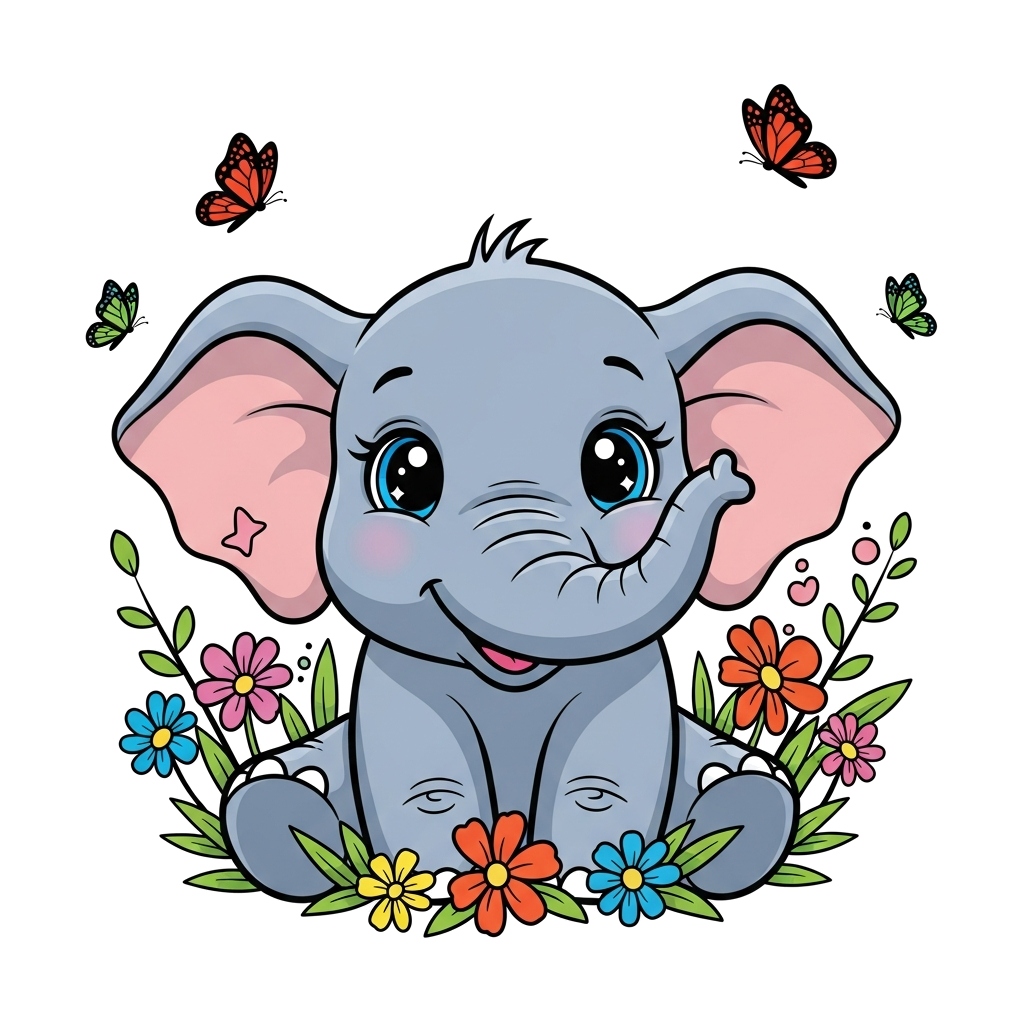 "A super cute baby elephant with big, sparkling eyes, smiling sweetly amidst colorful flowers and fluttering butterflies, in a cheerful cartoon style, vibrant and playful."