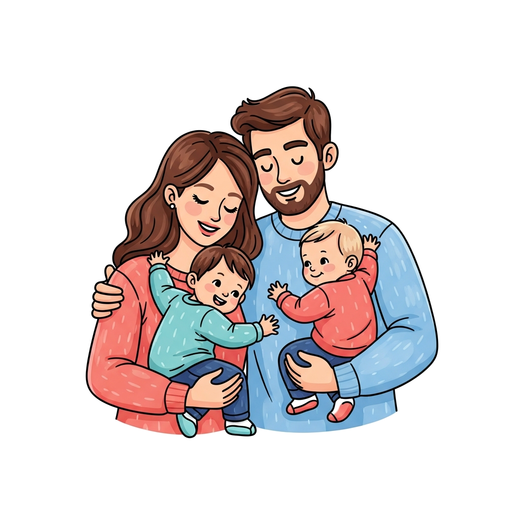 "A heartwarming illustration of a family of four (mother, father, older son, baby son). The parents are gently carrying their children, all smiling. Soft, pastel colors, hand-drawn style, cozy and loving atmosphere."