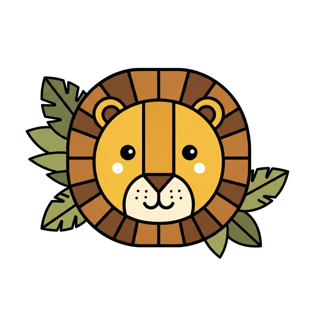 "A minimalist illustration of a friendly lion's face, composed of simple geometric shapes and clean lines, with a few stylized jungle leaves subtly integrated around it, in a warm, earthy color palette."