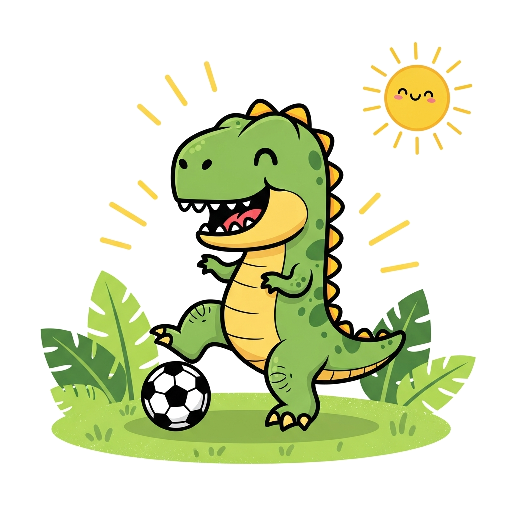 "A cute cartoon T-Rex dinosaur joyfully kicking a football on a grassy field, with playful jungle leaves and a bright sun in the background, vibrant colors, kawaii style."