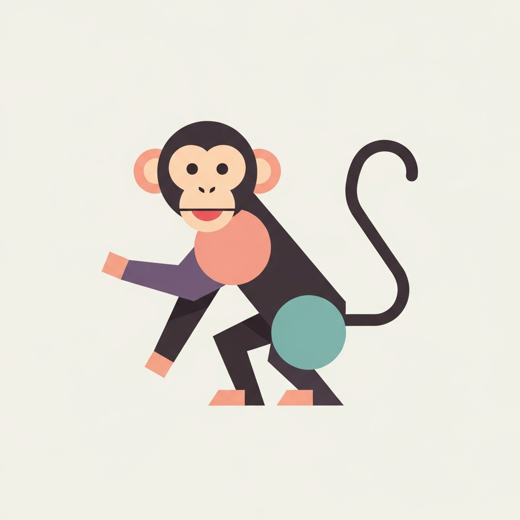 "A minimalist geometric illustration of a playful monkey, composed of simple, clean shapes in a modern pastel color palette, on a plain background, vector art style."