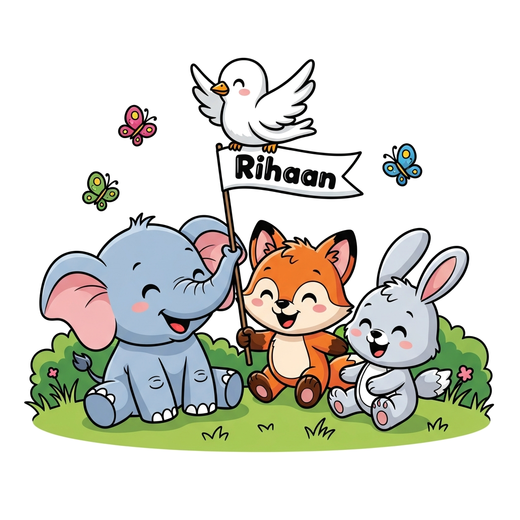 "A joyful cartoon scene with a baby elephant, a playful fox, and a fluffy rabbit all smiling and playing in a lush green meadow, with colorful butterflies fluttering around. The name 'Rihaan' is written in a cheerful, bubbly font on a small banner held by a cute cartoon dove. Bright and vibrant colors, kawaii style."