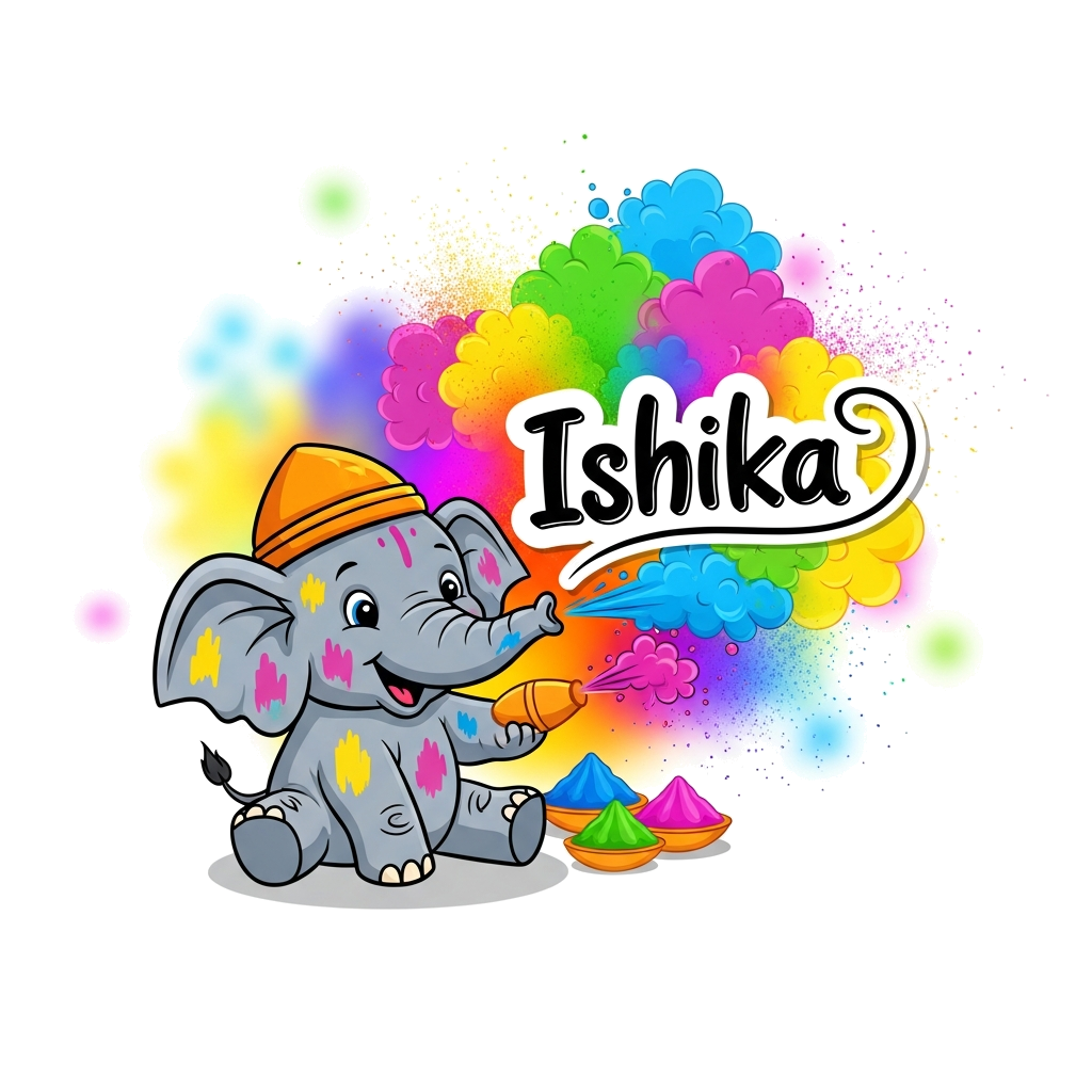 "A joyful cartoon baby elephant, playfully spraying colorful gulal with its trunk, surrounded by vibrant Holi colors and the name 'Ishika' written in a fun, flowing script. The background is a soft, celebratory blur of festive hues."