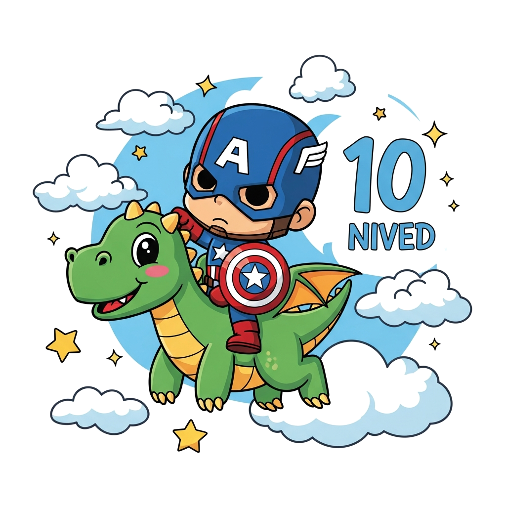 "A cute, chibi Captain America character, with his iconic shield, riding on the back of a friendly, cartoon-style dragon, soaring through a sky filled with fluffy clouds and sparkling stars. The number 10 is subtly integrated into the background, with 'Nived' written playfully below. Vibrant, child-friendly colors."