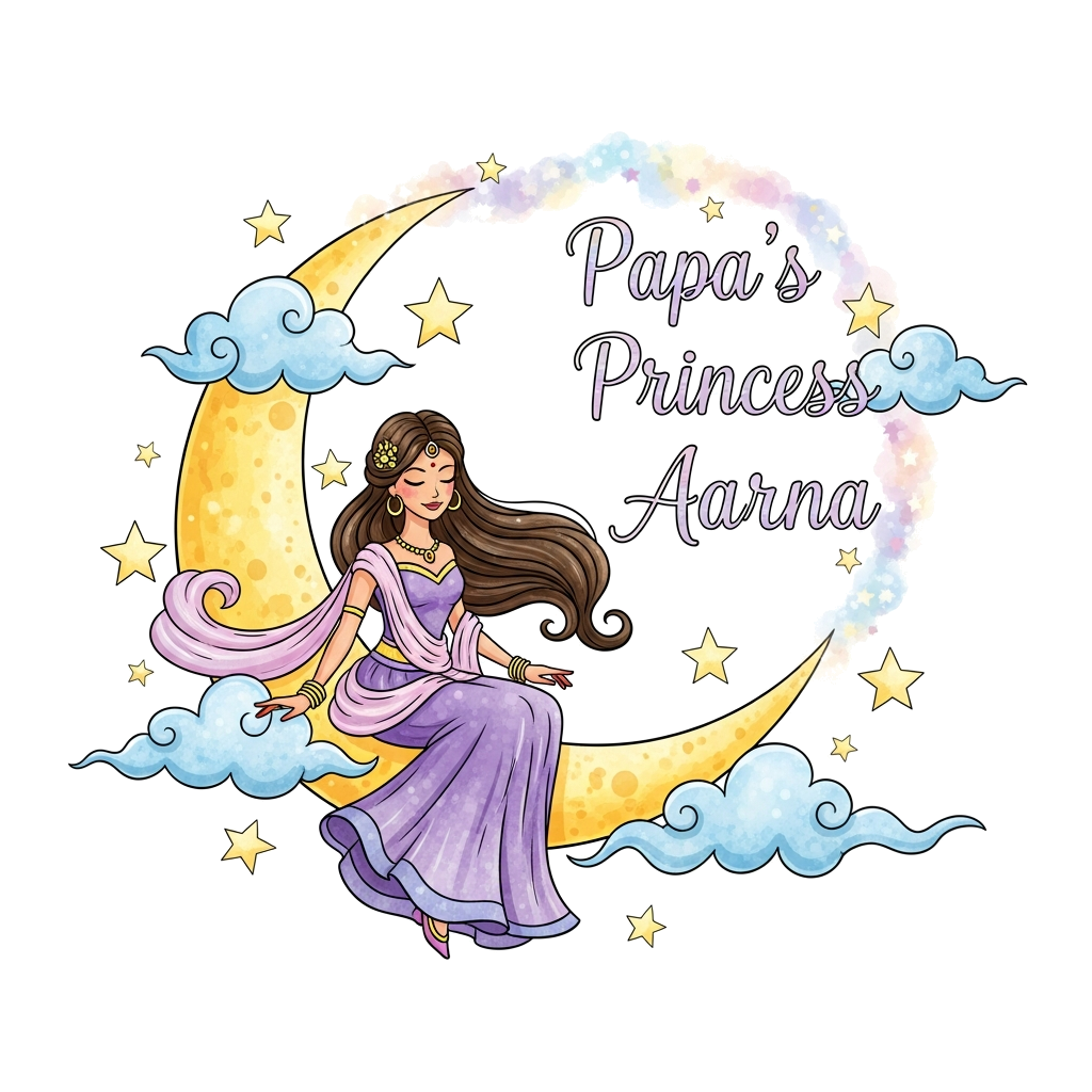 "An enchanting watercolor illustration featuring a regal Indian princess with long, flowing hair and a magical, iridescent gown, comfortably seated on a golden crescent moon. The words 'Papa's Princess Aarna' are beautifully displayed below her, seemingly etched into a trail of stardust, surrounded by glowing stars and soft, pastel-colored clouds."