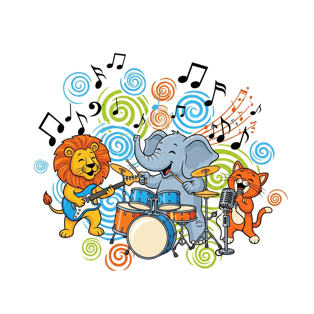 "A vibrant illustration of a joyful ensemble of cartoon animals: a lion playing a guitar, an elephant on drums, and a cat singing into a microphone, surrounded by swirling musical notes and abstract colorful patterns, in an artistic, hand-drawn style with bright, cheerful colors."