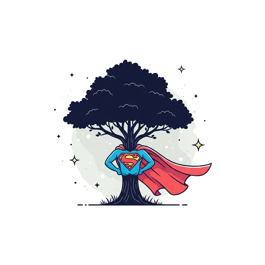 "A minimalist, artistic illustration of a majestic tree silhouette with its branches subtly forming a superhero cape, set against a soft, cosmic background with a few stylized stars. Clean lines, muted yet appealing colors."