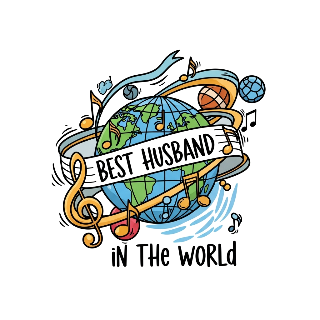 "A vibrant watercolor illustration featuring a stylized globe intertwined with musical notes and clefs, surrounded by subtle, abstract sports elements like a flowing ribbon representing movement or a blurred ball shape. The phrase 'Best husband in the world' is elegantly incorporated into the design as if hand-painted."
