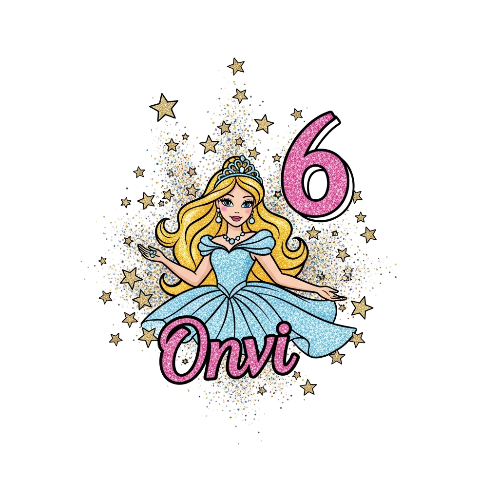 "A glamorous cartoon Barbie-like princess illustration, with long flowing hair and a sparkling gown, surrounded by a shower of glitter and stars, with the number '6' elegantly incorporated into the design, and the name 'Onvi' subtly integrated, vibrant and playful style."